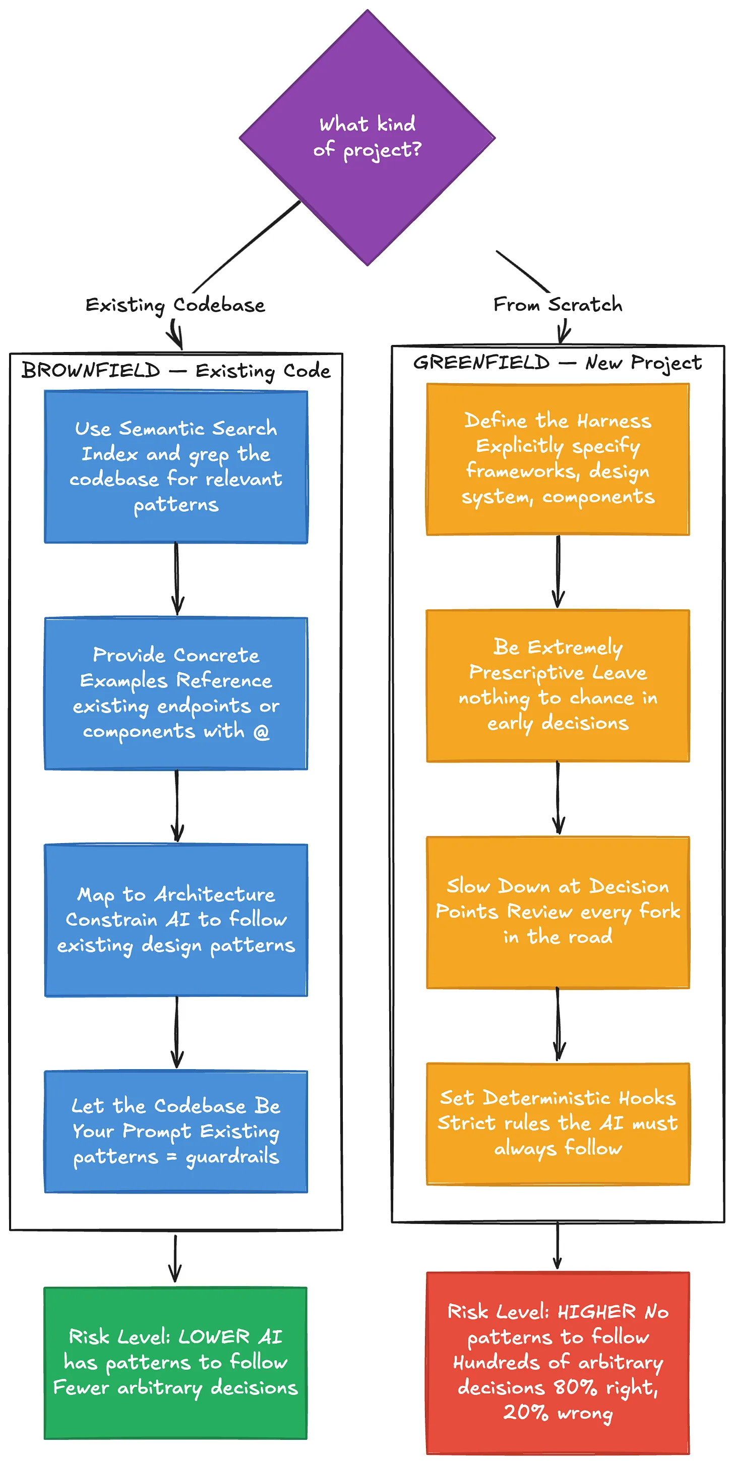 Greenfield projects are where things get dangerous. With no existing code to mimic, the AI has no guardrails. If you don’t guide it, it will make hundreds of small arbitrary decisions. Each one might be 80% likely to be correct — but compound 80% across hundreds of decisions and you end up with a mess.