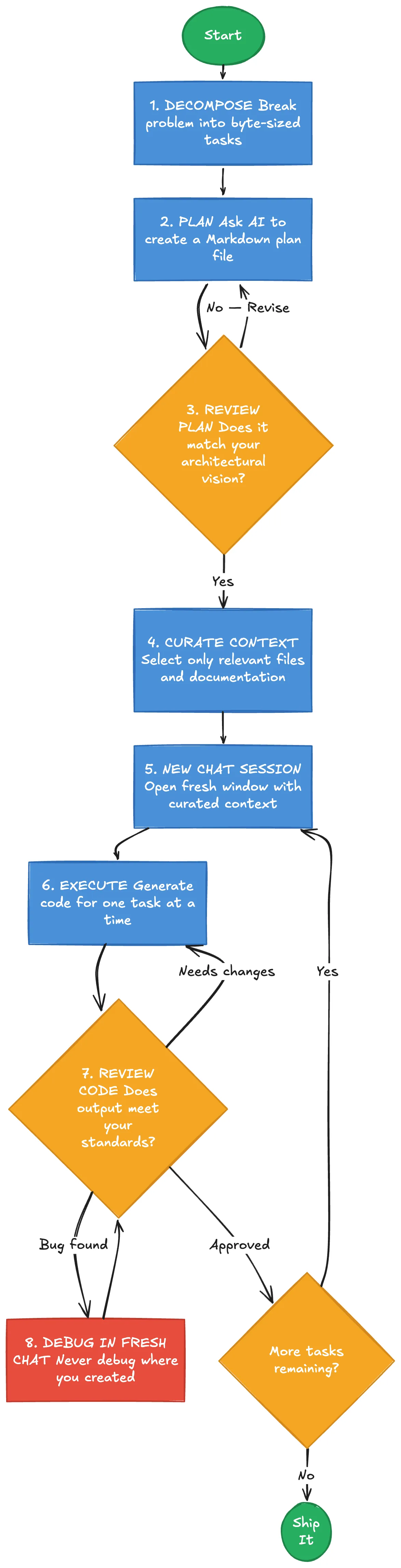 The single most important skill isn’t prompting — it’s decomposition. Large, complex problems need to be broken into byte-sized tasks that the AI is more likely to accomplish successfully. Think of it this way: if you wouldn’t hand the entire task to a junior engineer in one go, don’t hand it to the AI in one go either.