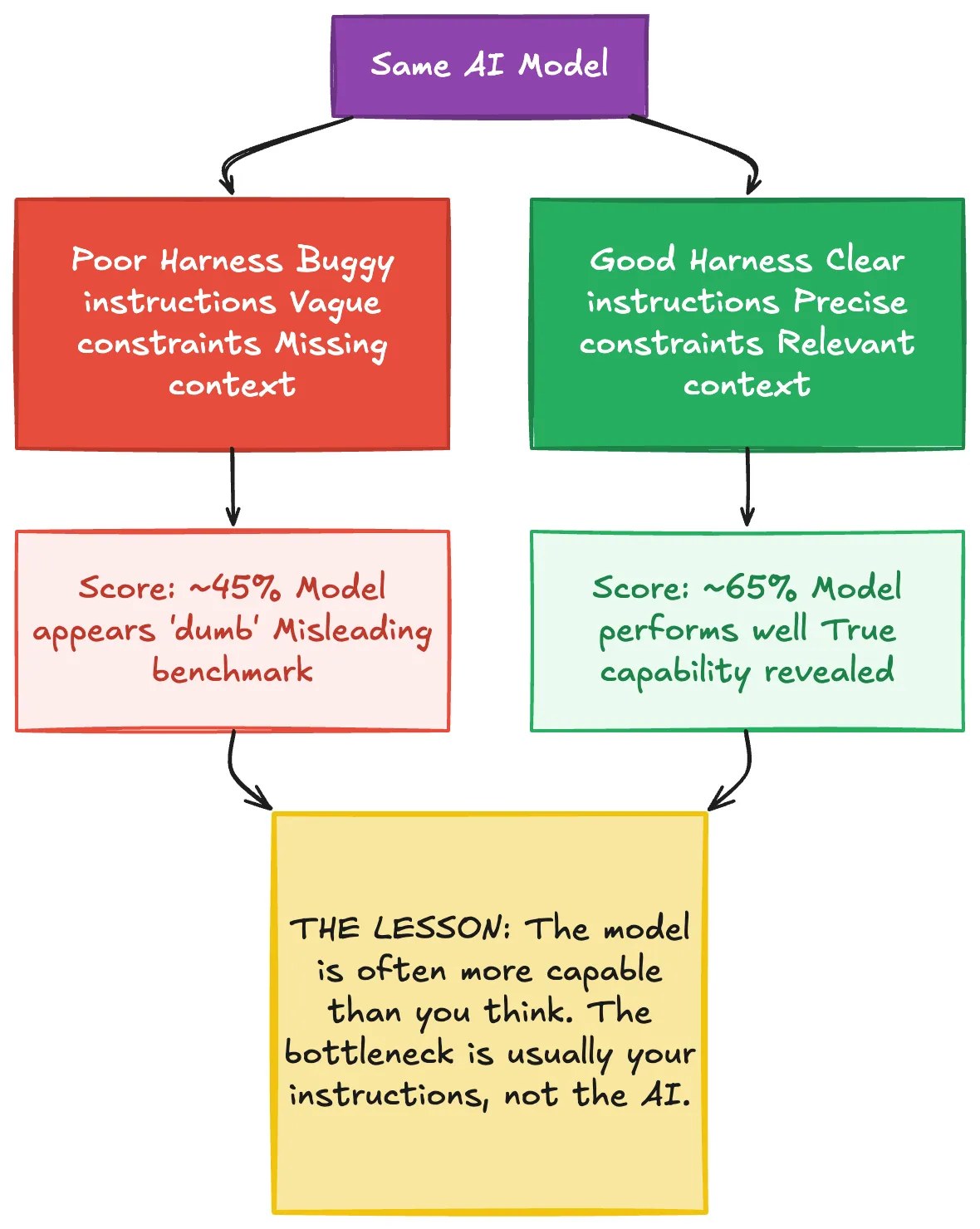 There’s a revealing anecdote from the development of a major AI coding platform. During internal benchmarking, a high-end model was scoring poorly — around 45%. The team was puzzled. They eventually discovered the problem wasn’t the model at all. The harness — the wrapper, instructions, and environment surrounding the model — had a bug. Once they fixed the harness, the score jumped to 65%.