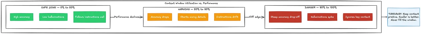 Research shows that once a context window gets about 50% to 80% full, there is a steep drop-off in accuracy and a sharp rise in hallucinations. The AI starts losing track of what matters, mixing up details, and confidently generating code that looks right but isn’t.