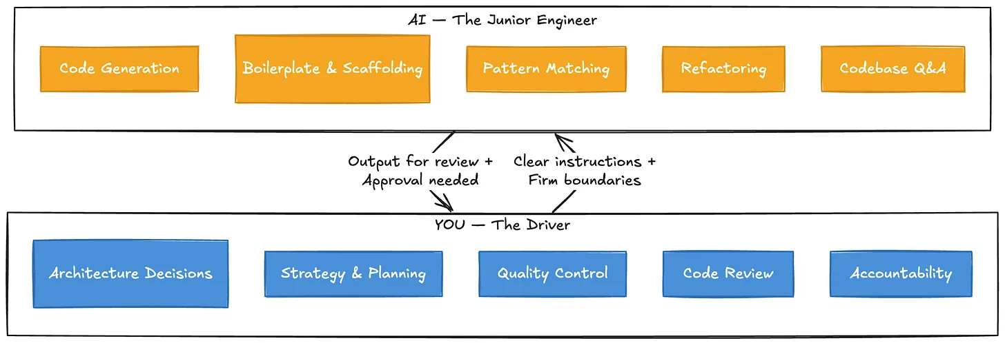 The diagram above captures the core relationship. You stay in the driver’s seat — owning architecture, strategy, and quality control. The AI handles execution within the lanes you define.